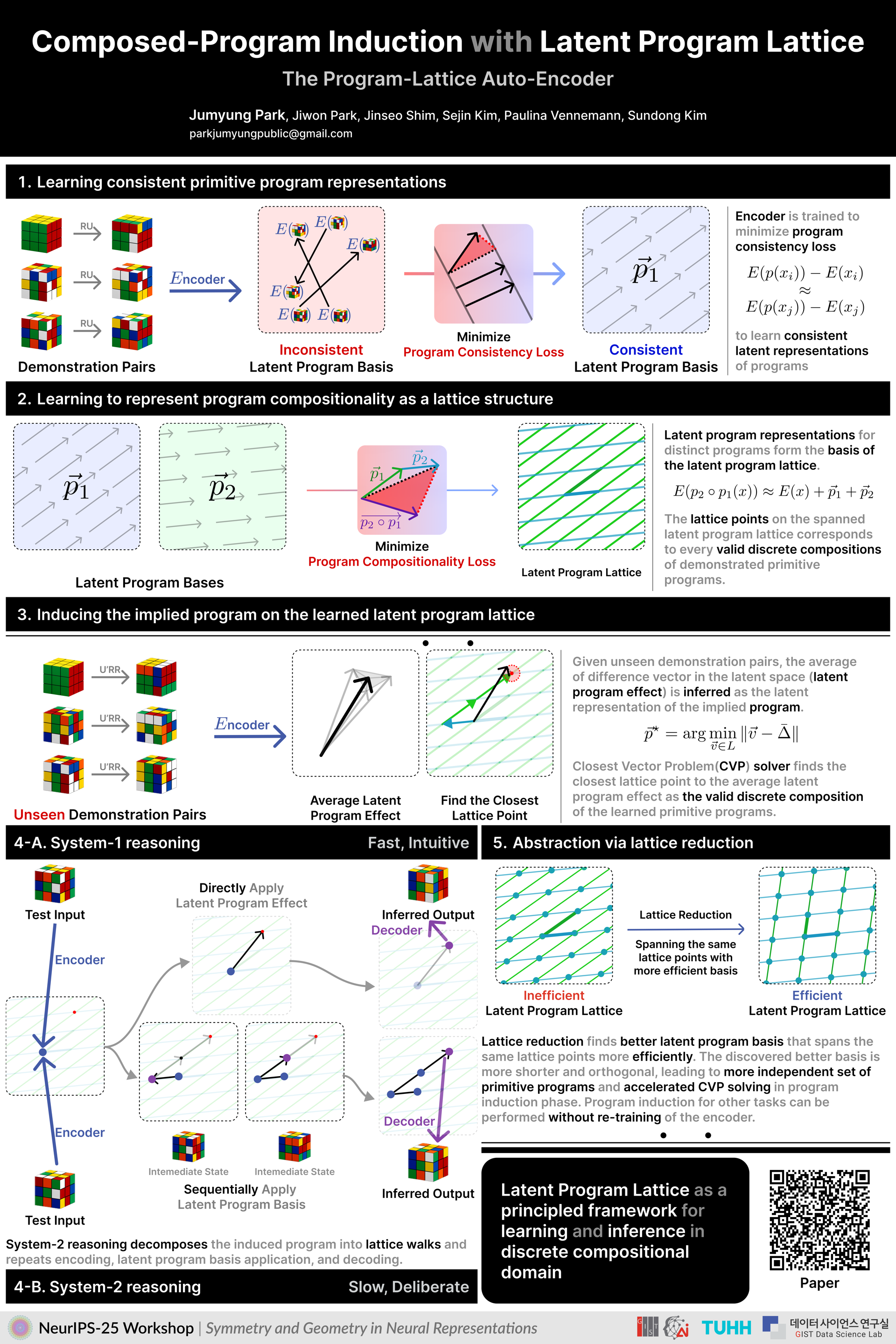 Compositional reasoning involves solving new problems by systematically combining basic primitives into structured transformations through three essential capabilities: learning compositional structure, inferring a program using trained compositional structure, and discovering refined primitives via abstraction of compositional structure. Existing approaches either lack explicit decomposition mechanisms for handling complex compositions or rely on hand-crafted primitives that limit adaptability. To address these limitations, we propose the Program Lattice Transformer (PLT) that learns compositional transformations with a structured latent program space. PLT preserves compositional structure by training an encoder where program effects and their compositions correspond to integer linear combinations of program bases, forming a discrete program lattice that captures the geometric structure of compositional reasoning. Program induction then reduces to solving a Closest Vector Problem (CVP) in this lattice, enabling principled inference through two complementary modes: fast System-1 reasoning via solving CVP to infer a composed program and deliberate System-2 reasoning through stepwise lattice walks with intermediate verification. The framework naturally supports abstraction discovery through lattice reduction, which refines primitive bases to improve efficiency and uncover more fundamental components. This work connects neural and symbolic reasoning by providing a mathematically principled framework for learning and inference in compositional domains.