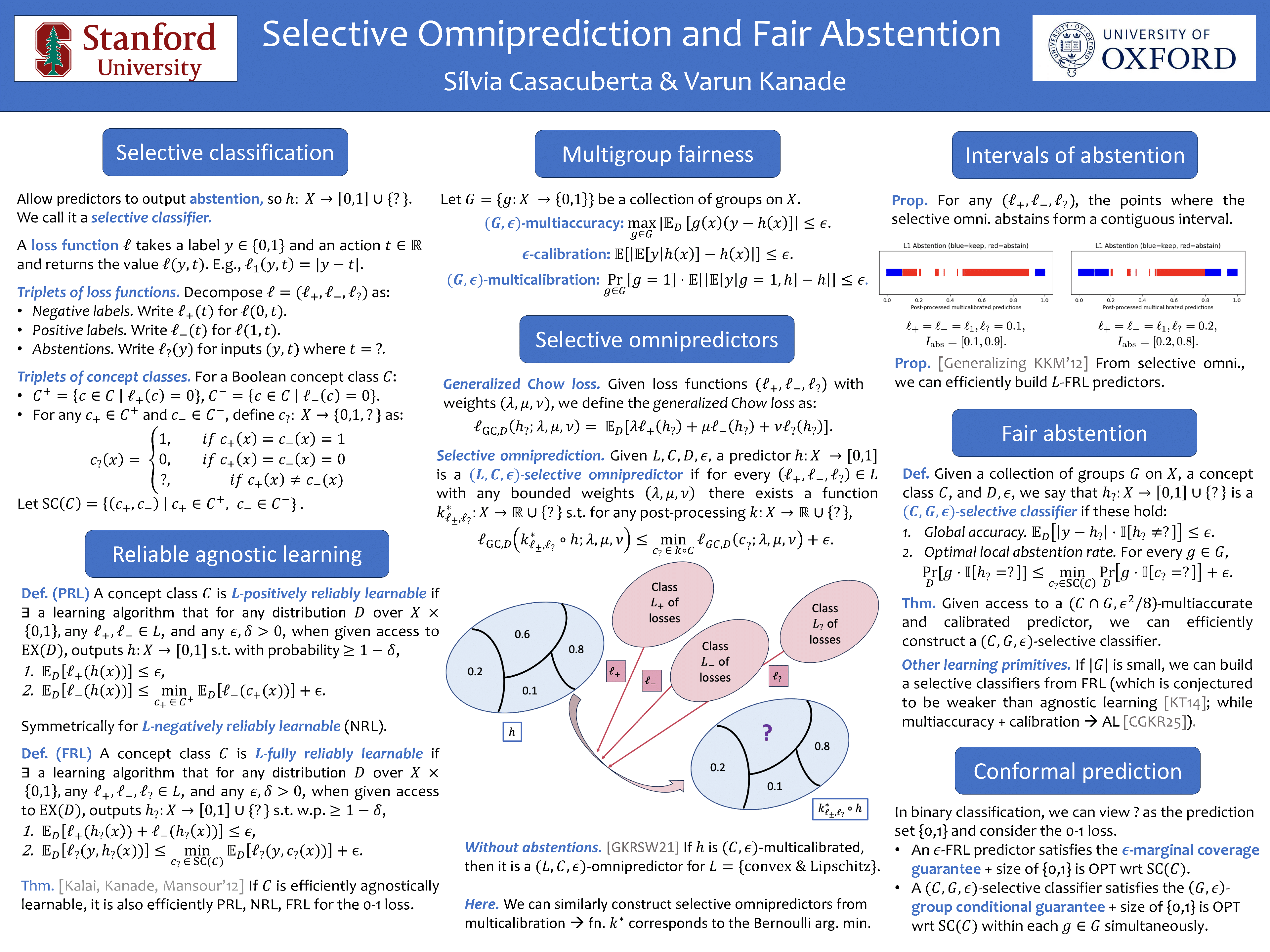 We propose new learning algorithms for building selective classifiers, which are predictors that are allowed to abstain on some fraction of the domain. We study the model where a classifier may abstain from predicting at a fixed cost. Building on the recent framework on multigroup fairness and omniprediction, given a pre-specified class of loss functions, we provide an algorithm for building a single classifier that learns abstentions and predictions optimally for every loss in the entire class, where the abstentions are decided efficiently for each specific loss function by applying a fixed post-processing function. Our algorithm and theoretical guarantees generalize the previously-known algorithms for learning selective classifiers in formal learning-theoretic models. We then extend the traditional multigroup fairness algorithms to the selective classification setting and show that we can use a calibrated and multiaccurate predictor to efficiently build selective classifiers that abstain optimally not only globally but also locally within each of the groups in any pre-specified collection of possibly intersecting subgroups of the domain, and are also accurate when they do not abstain. We show how our abstention algorithms can be used as conformal prediction methods in the binary classification setting to achieve both marginal and group-conditional coverage guarantees for an intersecting collection of groups. We provide empirical evaluations for all of our theoretical results, demonstrating the practicality of our learning algorithms for abstaining optimally and fairly.